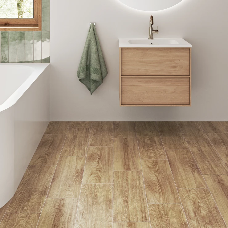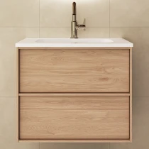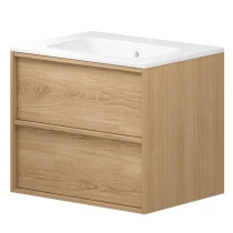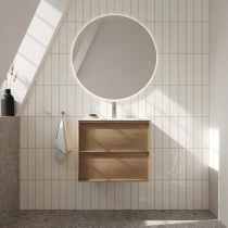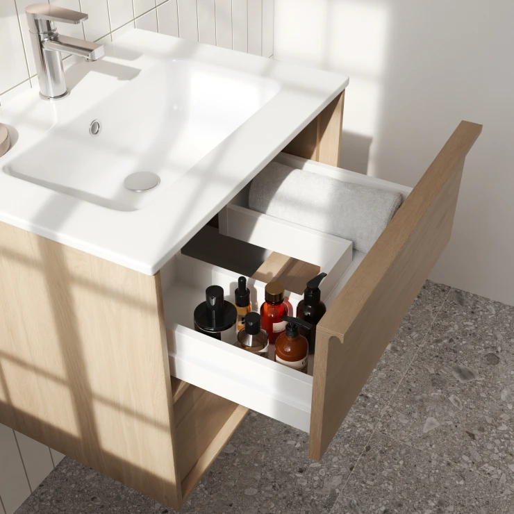 Njut av de integrerade ergonomiska handtagen av naturlig ek och gott om förvaring för dina saker i den rymliga handfatsenhetens lådor.