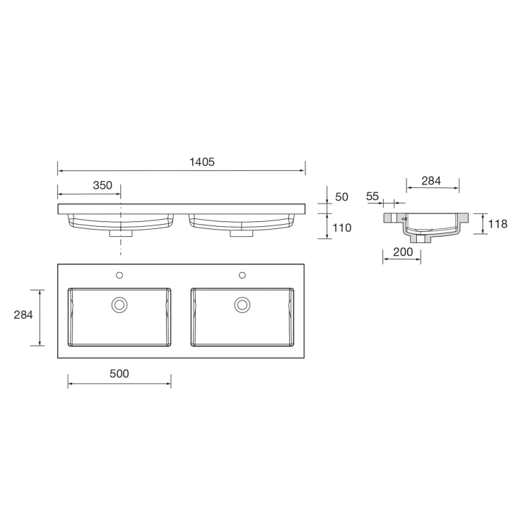Badrumsetet inkluderar ett dubbelt handfat ovanpå två tvättställsskåp (à 60 cm)
