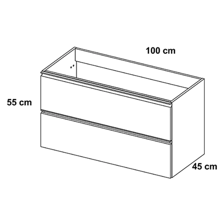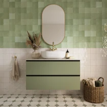 Material: Tvättställsskåp, Spånskiva, Handtag, Metallisk Profil med Epoxifinish; Bänkskiva, Hybridyta av Mineraler och Atervunnet Material
