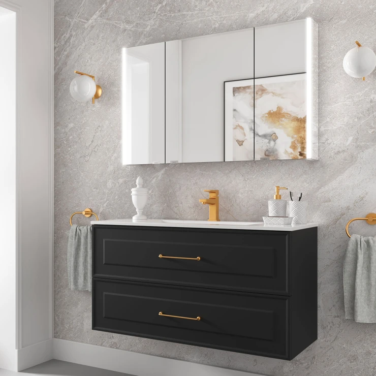 Tvättställsskåp Norrby Antracit Matt 100 cm med Handfat Vit Blank & Handtagen Lineya Guld