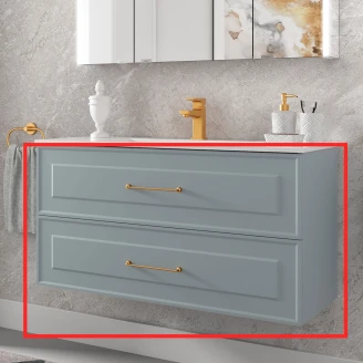 • Detta badrumsset innehåller: tvättställsskåp, tvättställ, handtagen