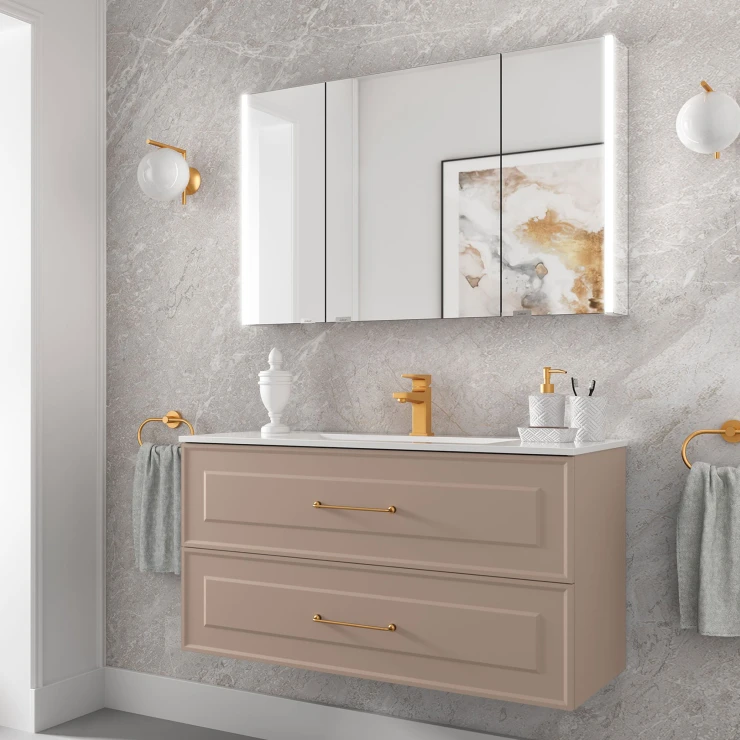 Tvättställsskåp Norrby Macchiato Matt 100 cm med Handfat Vit Blank & Handtagen Lineya Guld