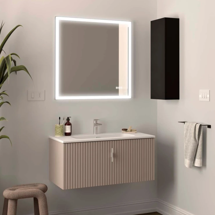 Runa erbjuder även högskåp och väggskåp i samma finish, vilket gör det möjligt att skapa en enhetlig och balanserad badrumsinredning.