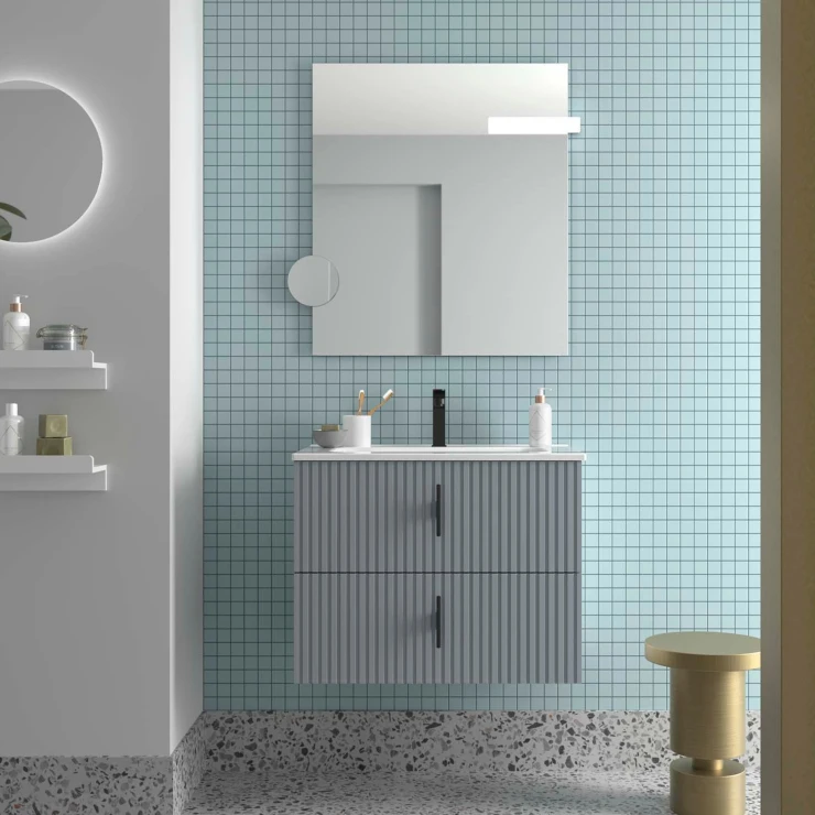 Runa erbjuder även högskåp och väggskåp i samma finish, vilket gör det möjligt att skapa en enhetlig och balanserad badrumsinredning.