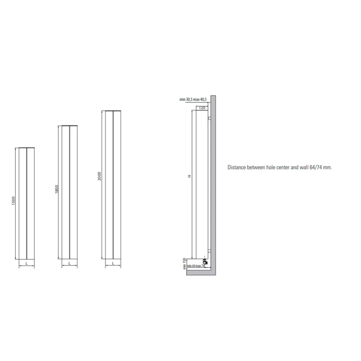 • Avstånd mellan hålcentrum och vägg: 64 / 74 mm
