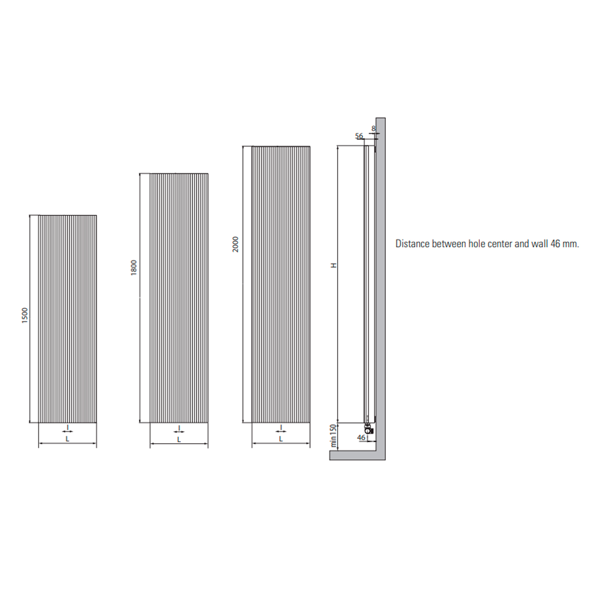 • - Avstånd mellan hålcentrum och vägg: 46 mm