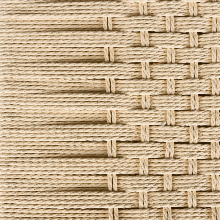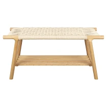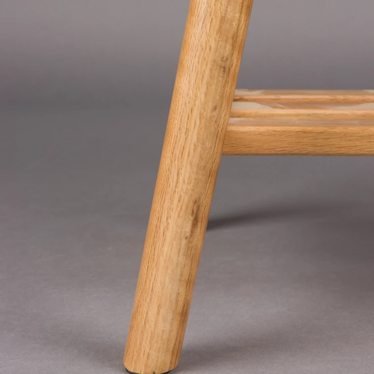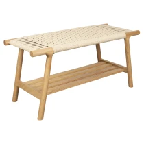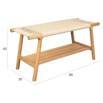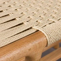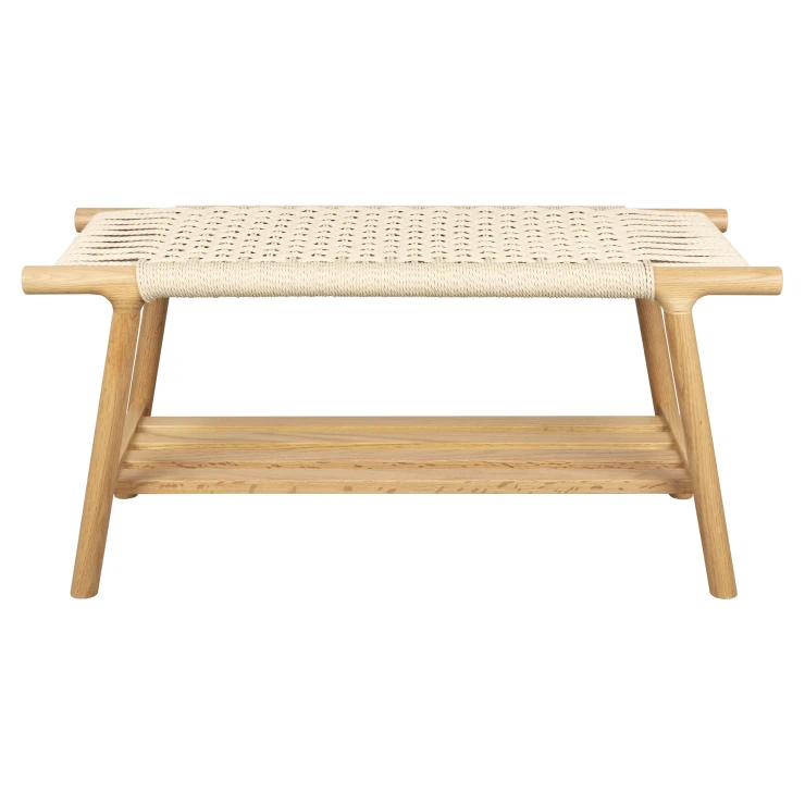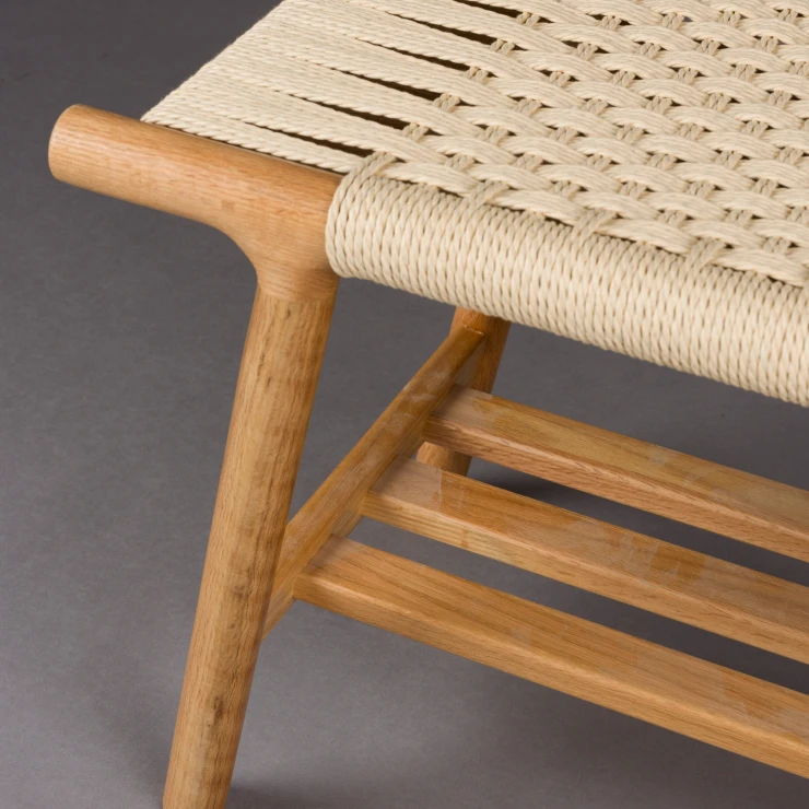 • Det som verkligen sticker ut är den särpräglade sitsen, tillverkad i horisontellt och vertikalt flätat rep som möts i mitten. Under sitsen finns en praktisk hylla med ribbor som ger plats för böcker, skor eller andra saker.