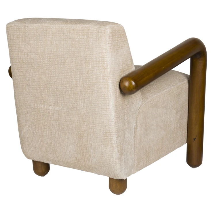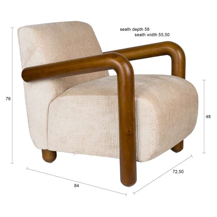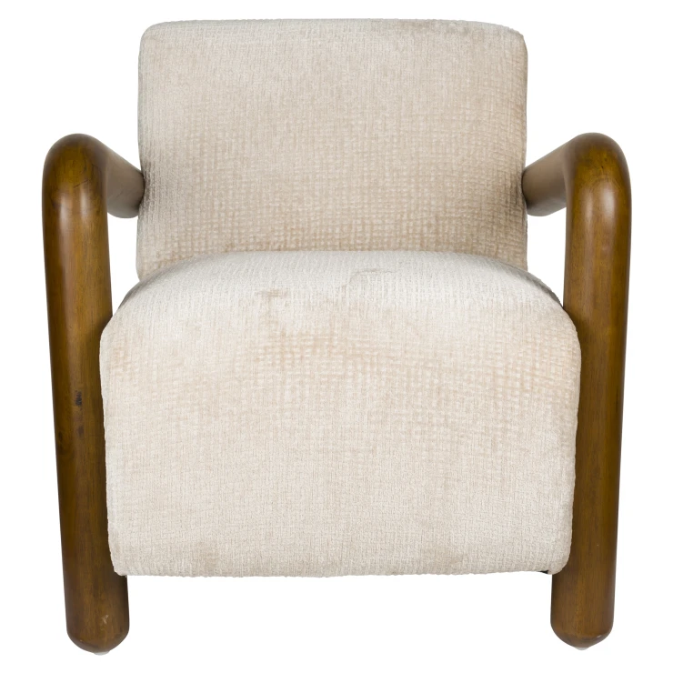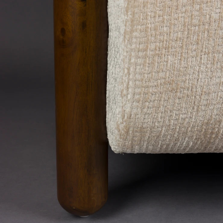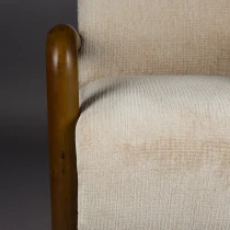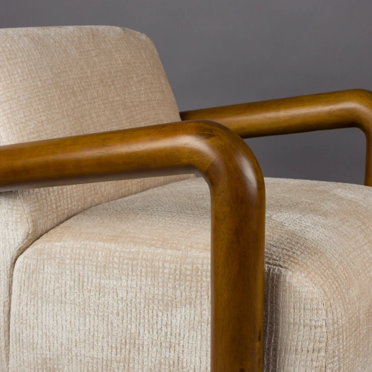 • Var du än placerar Dutchbone Robinson fylls rummet genast med en varm och ombonad atmosfär. Det första som fångar blicken är de breda, böjda armstöden i mangoträ. Tillsammans med benen i samma trä skapas en fantastisk kontrast mot den ljusa klädseln. Tyget känns underbart mjukt och har ett subtilt mönster av invävda linjer. Detta ger fåtöljen ett sofistikerat utseende som lika gärna kunde ha hört hemma i ett 1950- eller 1960-talets hem.