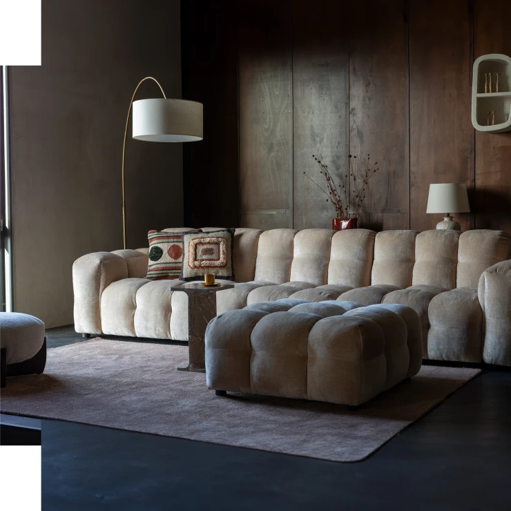 • Oavsett om du har en liten, mysig sittgrupp eller ett rymligt vardagsrum passar Dutchbone Hackman alltid in. Denna modulsoffa består av olika element som du kan kombinera efter eget önskemål. Använd ett enskilt element som fåtölj, ställ två bredvid varandra för en 3-sitssoffa eller bygg ut ytterligare för att skapa plats för hela familjen – precis det som passar ditt hem. Designen med kvadratiska paneler och de djupa tonerna i sammet- eller läderklädsel ger en härlig retro-känsla som genast förvandlar rummet till en varm och inbjudande plats.