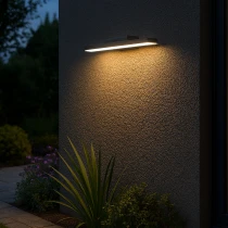 • Serien består av två varianter – Vägglampa 3000 K och Vägglampa 4000 K – med identiska mått (45×11,5×3,5 cm) och en diskret form som smälter in mot fasaden.