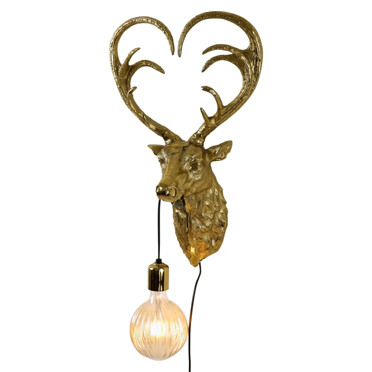 • Vägglampan Deer i guld kombinerar belysning och skulptur på ett unikt sätt, vilket gör den till ett iögonfallande dekorativt inslag. Designen avbildar ett stiliserat hjorthuvud med detaljerade horn, allt i en elegant guldfinish, vilket skapar en uttrycksfull väggdekoration. Denna lampa tillför en lekfull men sofistikerad känsla och passar perfekt i eklektiska miljöer eller för att ge värme åt rustika och moderna interiörer.