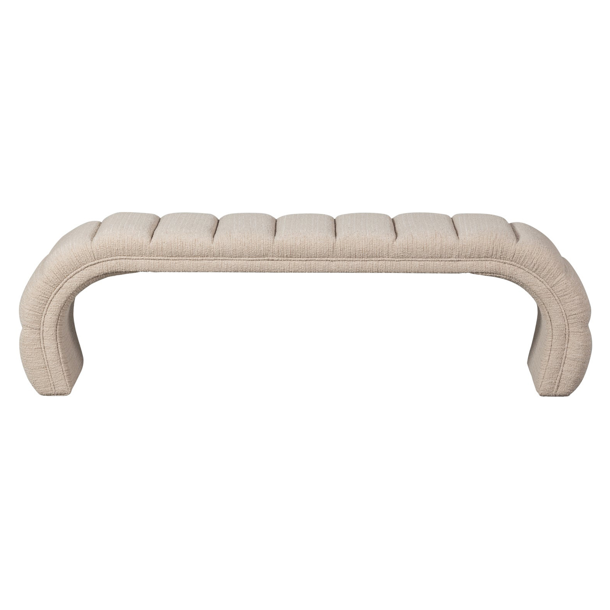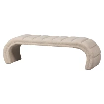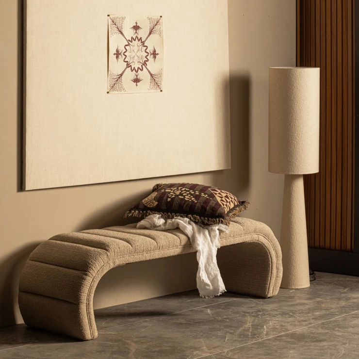• Bänken Traffic från WOOOD-kollektionen är ett lekfullt exempel. Bänken har ett slående sömmönster och är tillverkad av ett grovt vävt tyg med ett oregelbundet veckmönster. Tygets ulliga aspekt ger bänken ett mysigt utseende.