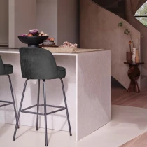 • Elegant och elegant är denna Vogue barstol från kollektionen från det holländska märket WOOOD. Benen är tillverkade av metall med svart pulverlackering. De vänliga runda formerna i kombination med det mjuka, fylliga sammetstyget gör denna barstol till ett smycke för dagens inredning.