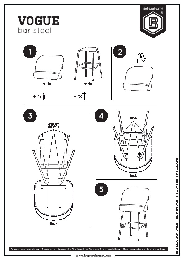 Barstolen levereras i ett paket. Benen monteras enkelt själv med hjälp av de medföljande monteringsanvisningarna. För att skydda hårda golv, placera filtglidare under benen (2 cm runda), detta förhindrar skador.