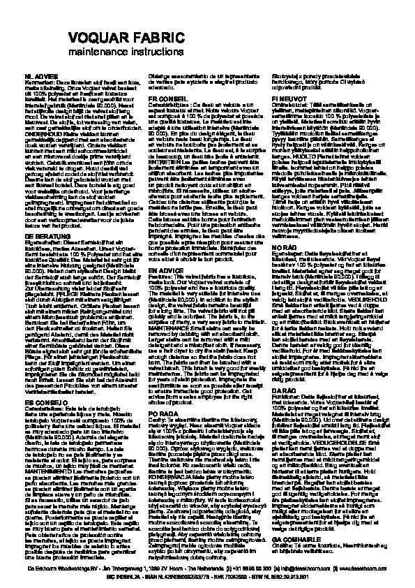 Detta sammetstyg har ett lyxigt, matt utseende. Vår Voquar-sammet består av 100 % polyester och har en lyxig kvalitet. Materialet är mycket lämpligt för intensiv användning (Martindale 90 000). Förutom den snygga designen förblir sammetstyget vackert länge. Sammetstyget noppar inte lätt och är färgäkta. Tyget är, till mångas förvåning, ett mycket lättskött tyg. Basen på Vogue barstol är tillverkad av metall med en mattsvart pulverlackering. Sitsramen är tillverkad av en kombination av spånskiva och plywood. Sitsen innehåller elastiska remmar och ett T3542-skum som ger en något fast sittkomfort som varar i timmar. Ryggstödet är fyllt med T2120-skum.