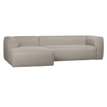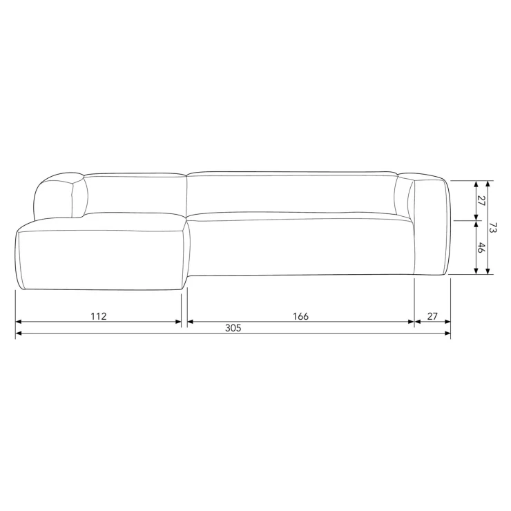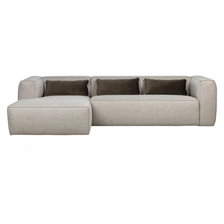 • Denna Bump hörnsoffa vänsterutförande från kollektionen från det holländska märket WOOOD Exclusive är en verkligt bekväm soffa med en robust stomme. Bump-soffan är klädd med ett slitstarkt tyg (85 % polyester och 15 % bomull), Martindale 35 000. Detta tyg är vatten- och fläckavvisande behandlat. De extra matchande dekorkuddarna (hxb) kompletterar Bump. Bump hörnsoffa (hxbxd) 73x305x96/175 cm har en sitthöjd på 45 cm och ett sittdjup på 66 cm. Armstöden är 73 cm höga och 32 cm breda. Detta ger soffan en fin stomme. Bump-soffans stomme består av: spånskiva, bok och furu. Soffan har en bekväm, fast sittkomfort. Sittdynorna har en fyllning av T42-skum, ett massivt skum med lång livslängd, och HR30, ett skum med hög elasticitet, dynamisk formbeständighet och hög användarkomfort. Skummet har hög luftgenomsläpplighet och återgår snabbt till sin ursprungliga form. Ryggdynorna är fyllda med samma skum för en bekväm sittplats. Denna soffa levereras i separata element. Elementen är enkla att koppla ihop med varandra med hjälp av fästen. För hårda golv, placera filtglidare under benen. Detta förhindrar skador på golvet.