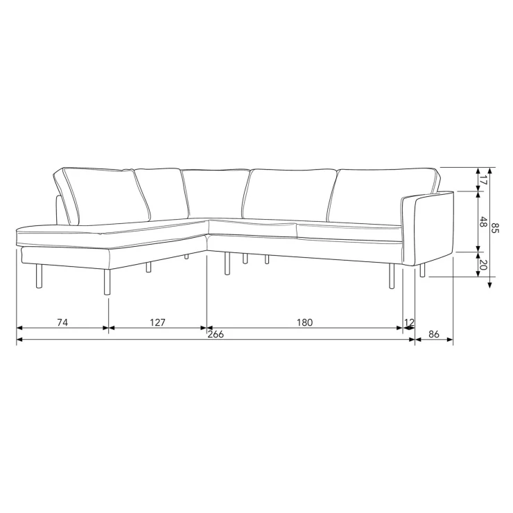 - Den generösa hörnsoffan har en totalhöjd på 85 cm, en bredd på 266 cm och ett djup på 86 cm. Hörnsektionen har ett totalt djup på 213 cm. Sitthöjden är 45 cm och sittdjupet är 60 cm, vilket ger ett bra stöd. Sittbredden mellan armstödet och hörndynan är 266 cm och är uppdelad i tre separata sitt- och ryggdynor. Armstöden har en bredd på 12 cm och en höjd på 68 cm, mätt från golvet. Metallbenen är 20 cm höga. Soffan klarar 250 kg när den är jämnt fördelad.