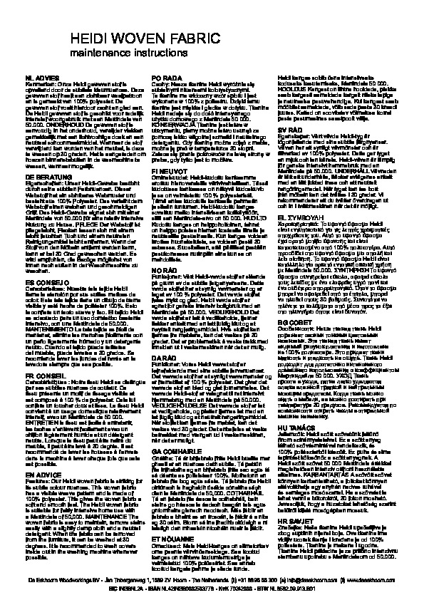 Det vävda tyget är lätt att underhålla, fläckar kan enkelt tas bort med en lätt fuktad trasa och ett neutralt tvättmedel. När tyget kan tas bort från möblerna kan det tvättas i 30 grader. Det rekommenderas att tvätta överdragen ut och in i tvättmaskinen, när det är möjligt.