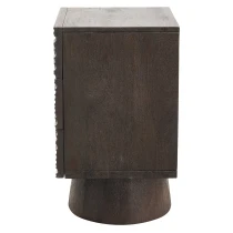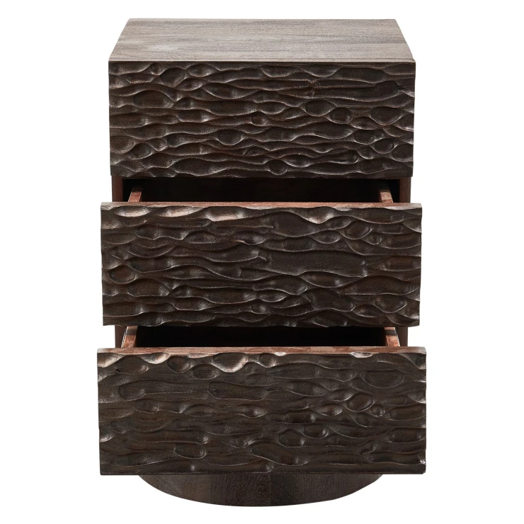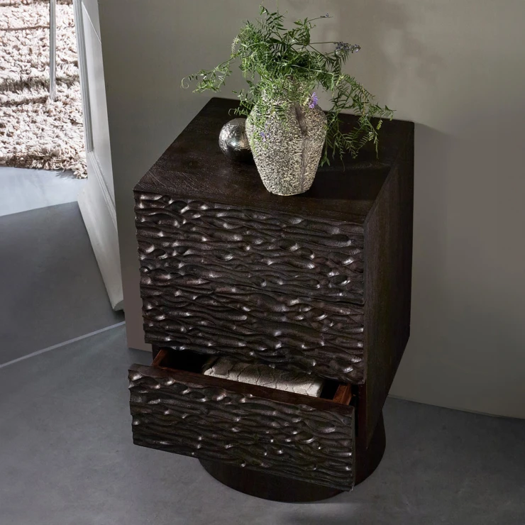 • Lekfullt, varmt och effektivt: det är kännetecknen för nattduksbordet Crumble från kollektionen från det holländska inredningsmärket WOOOD. Nattduksbordet får ett autentiskt utseende med sin lekfulla struktur och breda ben. Dessutom finns det tillräckligt med utrymme för att placera tillbehör på möblerna eller förvara saker i de tre lådorna. VARNING: Tipprisk! För möbler högre än 50 cm rekommenderar vi att du är extra noggrann med väggmonteringen. Fallskyddande montering förhindrar olyckor och skyddar möblerna från att välta.