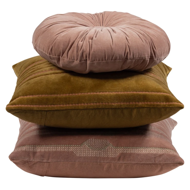 • Feis kuddset är en del av kollektionen från det holländska inredningsmärket WOOOD. Detta eleganta set består av två fyrkantiga kuddar och en rund kudde, vars överdrag är tillverkade av 100 % bomull. Tygets struktur har en subtil lyster, vilket skapar ett lyxigt och elegant utseende. De rika bronsfärgade och rosa nyanserna ger din inredning en varm och elegant atmosfär. Perfekt för dig som vill ge sitt vardagsrum eller sovrum den där extra touchen! Feis kuddar finns endast tillgängliga som ett komplett set.
