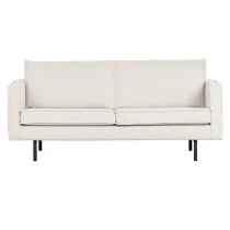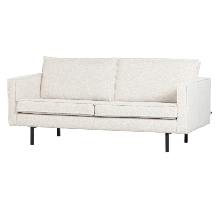Rodeo-soffan är tillverkad av en kombination av massivt trä, spånskiva, polyuretanskum med en densitet på 25 kg/m3 och sicksackfjädrar. Sitsen innehåller polyuretanskum med en densitet på 30 kg/m3 (T3037). Ryggstödet består av en kombination av 70 % skuret skum och 30 % silikon. Denna Rodeo är klädd i mjuk bouclé. Materialet i Colmar bouclé-tyget svarar på den senaste trenden: mjuka material. Tyget är mjukt och har en elegant textur som omedelbart ger värme till ditt hem. Vårt Colmar bouclé-tyg har en Martindale-klassning på 100 000, vilket innebär att det är lämpligt för intensiv användning. Den täta väven säkerställer tygets styrka, vilket innebär att boucléen inte slits ut eller rivs sönder lätt. Varje färg har också hög färgbeständighet, men det rekommenderas att undvika direkt solljus för att undvika färgskiftningar.