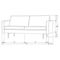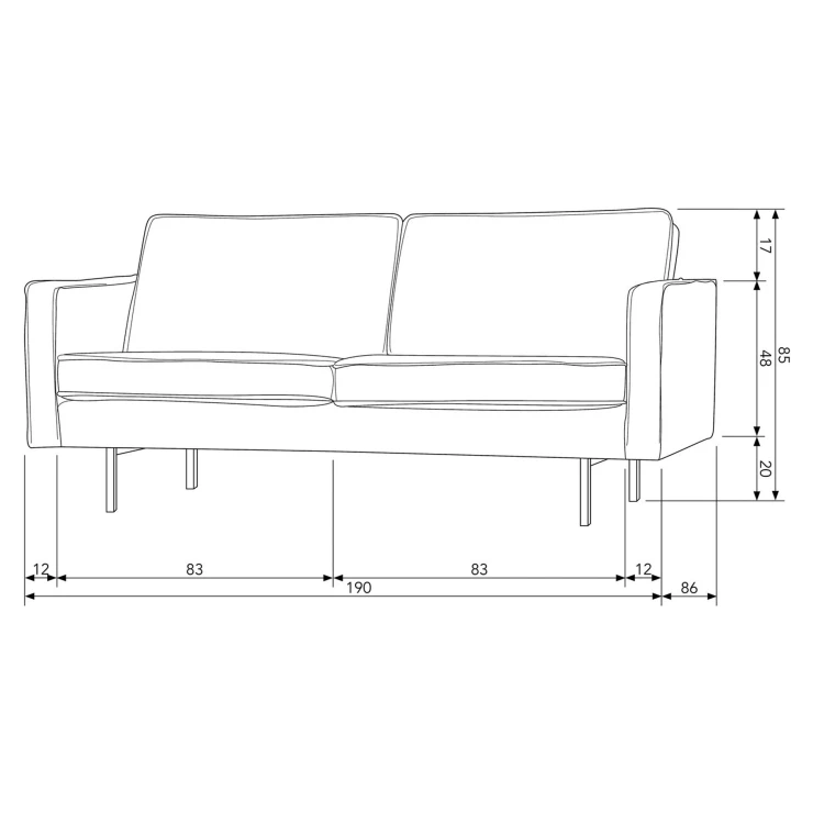 - Rodeo 2,5-sitssoffan har en totalhöjd på 85 cm, en bredd på 190 cm och ett djup på 86 cm. Sitthöjden är 45 cm och sittdjupet är 60 cm, vilket ger ett bra stöd. Sittbredden på denna 2,5-sitssoffa är 166 cm och är uppdelad i två separata sitt- och ryggdynor. Armstöden har en bredd på 12 cm och en höjd på 68 cm, mätt från golvet. Metallbenen är 20 cm höga. Soffan klarar 200 kg när den är jämnt fördelad.