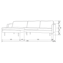- Den rymliga schäslongen har en totalhöjd på 85 cm, en bredd på 300 cm och ett djup på 86 cm. Den långa fåtöljen har ett totalt djup på 155 cm. Sitthöjden är 45 cm och sittdjupet är 60 cm, vilket ger ett bra stöd. Den långa fåtöljen har ett sittdjup på 125 cm. Sittbredden mellan de två armstöden är 276 cm och är uppdelad i tre separata sitt- och ryggdynor. Armstöden har en bredd på 12 cm och en höjd på 68 cm, mätt från golvet. Metallbenen är 20 cm höga. Soffan klarar 250 kg när den är jämnt fördelad.