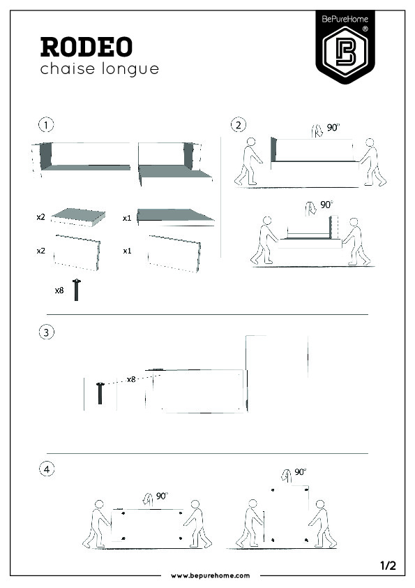 Schäslongen Rodeo levereras i två paket. Benen är enkla att montera med hjälp av de medföljande monteringsanvisningarna. För att skydda hårda golv, placera filtglidare på undersidan av benen.