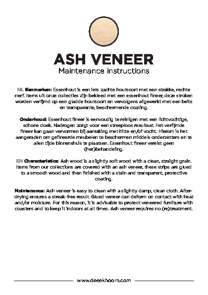 Sitsen är tillverkad av plywood, täckt med askfaner. Basen är tillverkad av en stålram i mattsvart. Askträ är ett något mjukt träslag med en tät, rak ådring. Det raka ådringsmönstret säkerställer att askträet kan böjas väl, vilket gör det mycket lämpligt för möbelindustrin. Behandlat askträ är starkt och slitstarkt, men obehandlat askträ kan röra sig mycket och snabbt gulna. Slipad ask ger ett snyggt, slätt utseende. Borstad ask har mer karaktär och bandsågad ask har ett mycket robust och grovt utseende.