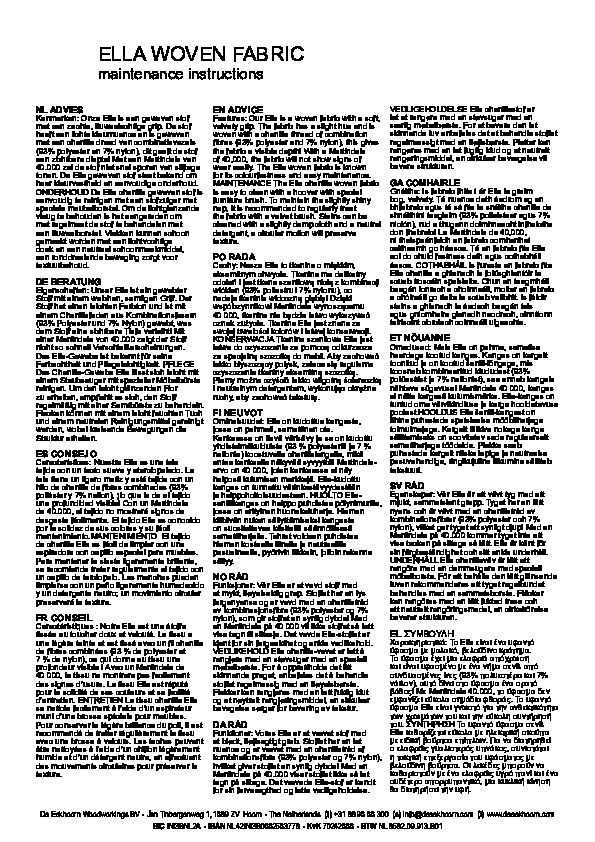 Vårt Ella-tyg är ett vävt tyg med ett mjukt, sammetslent grepp. Tyget har en svag nyans och är vävt med en chenilletråd av kombinationsfibrer (93 % polyester och 7 % nylon), vilket ger tyget ett synligt djup! Med en Martindale på 40 000 visar tyget inga tecken på slitage så lätt. Det vävda tyget Ella är känt för sin färgbeständighet och enkla underhåll.