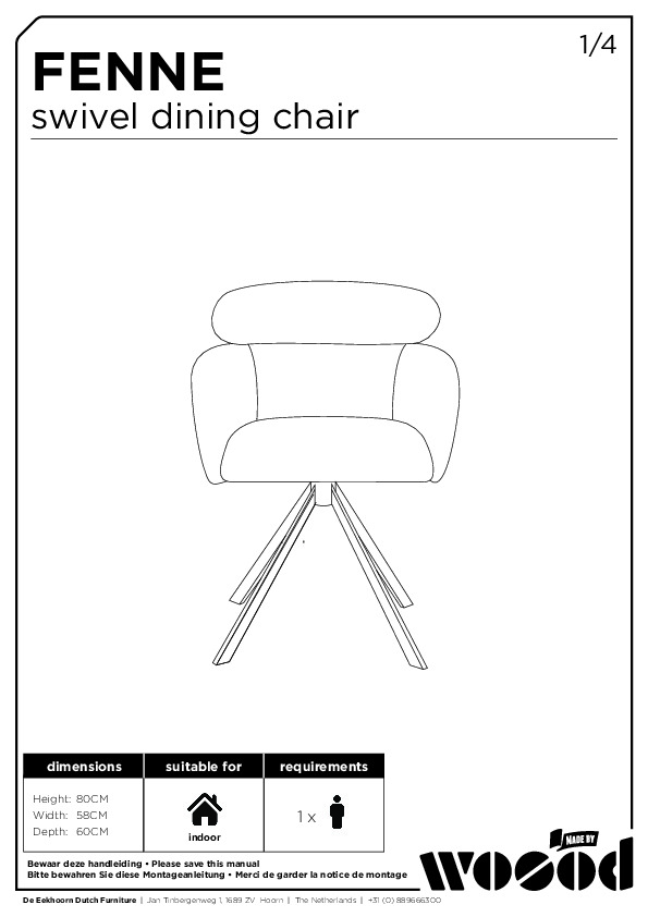 Fenne levereras parvis. Artikeln är enkel att montera med hjälp av de medföljande monteringsanvisningarna. För att skydda hårda golv, placera filtglidare under benen.