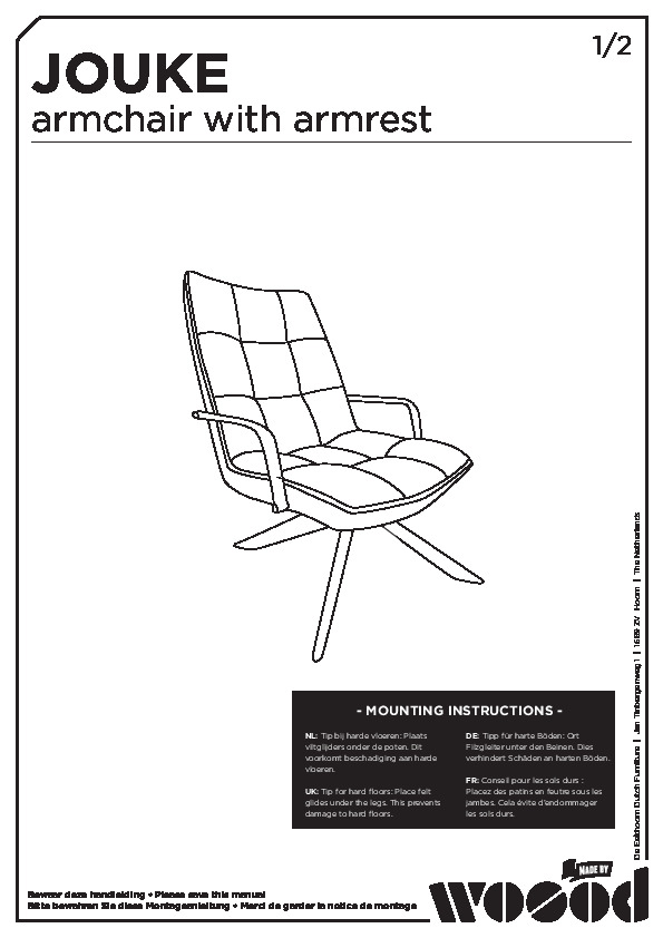 Artikeln levereras som ett enkelt byggsats med tydliga monteringsanvisningar. För hårda golv, placera filtglidare under benen. Detta förhindrar skador på golvet.