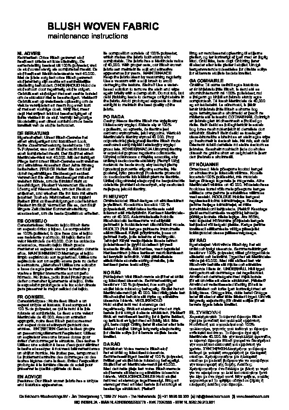 Kompositionen består av 100 % polyester, vilket gör tyget både robust och bekvämt. Tyget har ett Martindale-värde på 40 000. Med rätt skötsel kan vårt Blush-vävda tyg behålla sitt mjuka och attraktiva utseende i åratal.