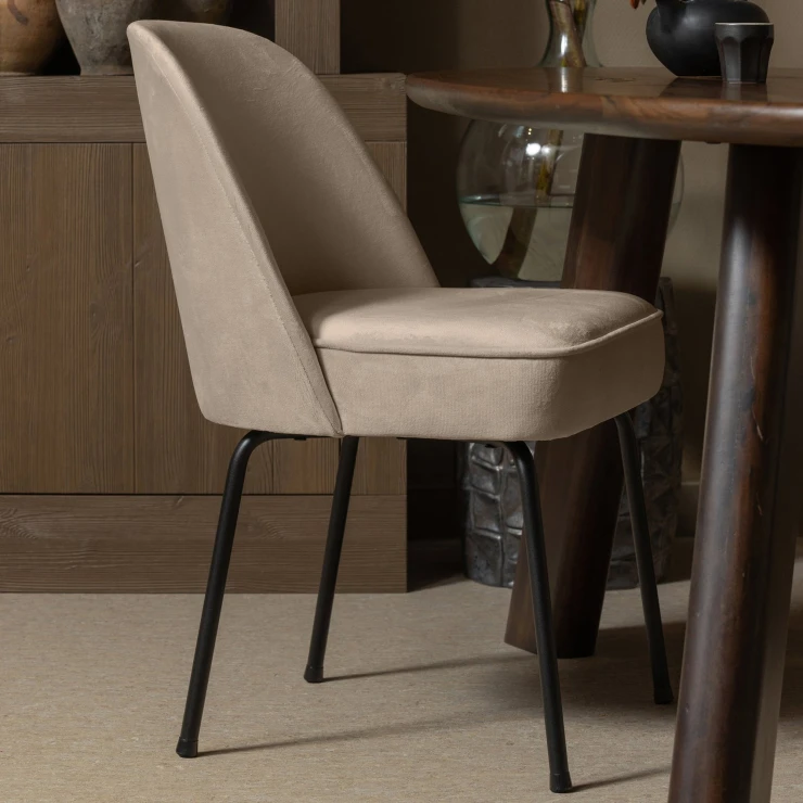 • Matstolen Vogue kommer från kollektionen från det holländska märket WOOOD. Matstolen är superbekväm och det mjuka tyget och de vänliga runda formerna gör denna eleganta matstol till en prydnad i dagens inredning. Tack vare den smala designen passar stolen bra in i flera olika boendestilar.