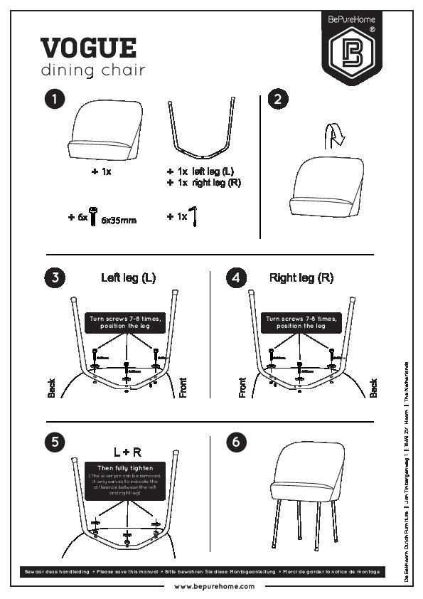 Matsalsstolen levereras i två delar i ett paket. Benen monteras enkelt själv med hjälp av de medföljande monteringsanvisningarna. För att skydda hårda golv, placera filtglidare under benen (2 cm runda), detta förhindrar skador.