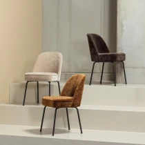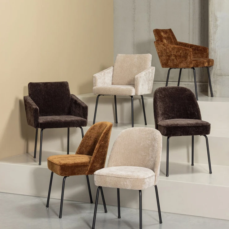 • Matstolen Vogue kommer från kollektionen från det holländska märket WOOOD. Matstolen är superbekväm och det mjuka tyget och de vänliga runda formerna gör denna eleganta matstol till en pärla för dagens inredning. Med sin smala design passar stolen bra in i flera olika boendestilar.