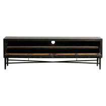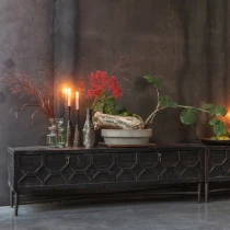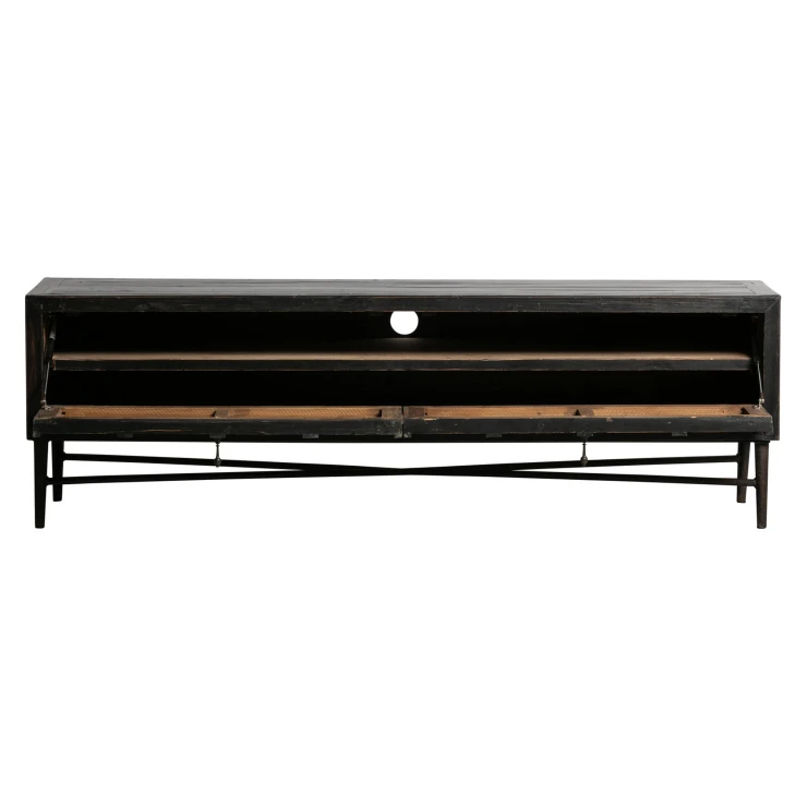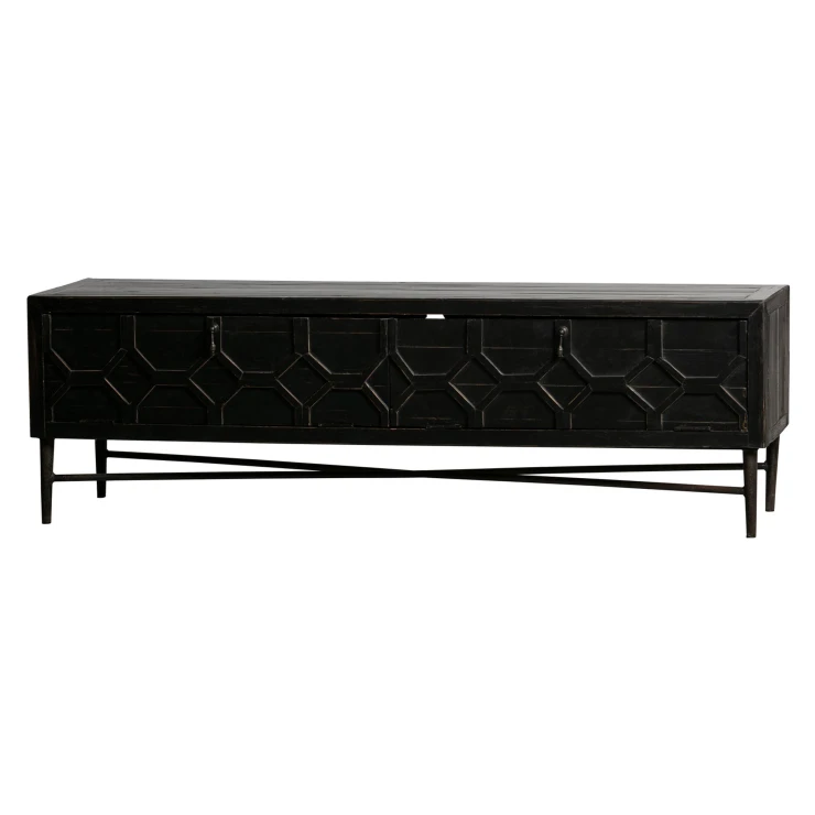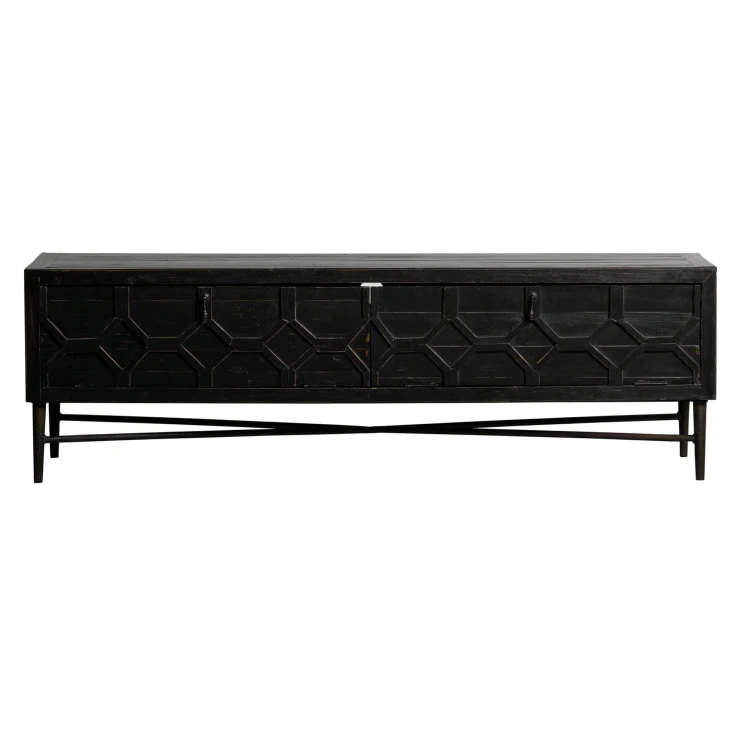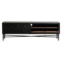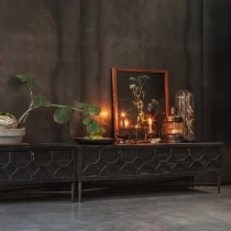 • TV-skåpet Bequest är en del av Bequest-serien från det holländska inredningsmärket WOOOD. Bequest-serien är tillverkad av återvunnen furu och har den distinkta designen av snidat träarbete på låd- och dörrfronterna. Den antiksvarta finishen ger denna möbel den bebodda looken. Metallbasen säkerställer att Bequest tål mycket vikt och är stabil på raka ytor.