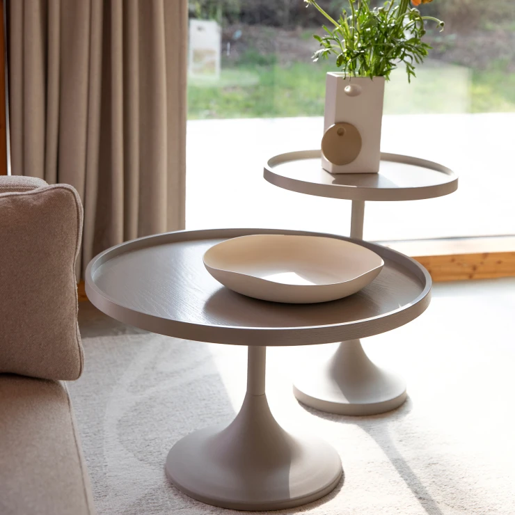 • Vid första anblick kan Jason-borden och klädhängaren från Zuiver se ut som en enda sammanhängande enhet. Men de är faktiskt tillverkade av två olika material – båda med samma matta finish. När solljuset träffar möblerna blir kontrasten mellan ekfanéren och metallens struktur tydligare. I kombination med de mjuka, rundade formerna skapas en lekfull effekt – det perfekta receptet för ett oemotståndligt utseende.