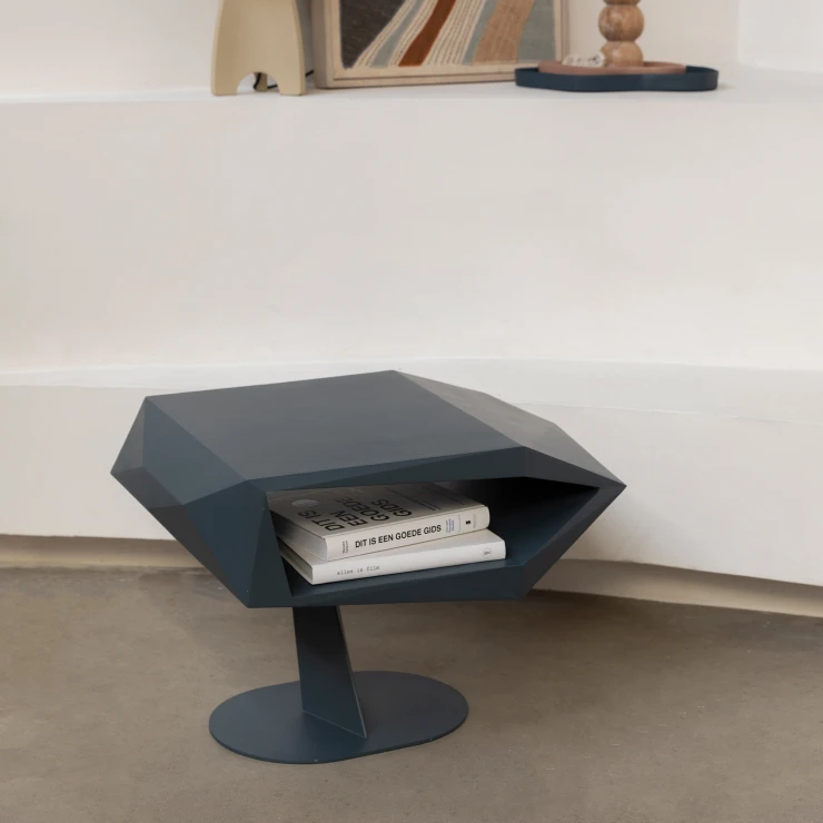 • Sidobord North har en form som kanske känns bekant – det är inspirerat av Amsterdams ikoniska Eye Film Museum. Den unika designen drar genast till sig uppmärksamhet, medan materialkombinationen av stål och resin med matt finish skapar en stilfull effekt. Använd det i vardagsrummet för att visa tidningar eller i sovrummet som nattduksbord.