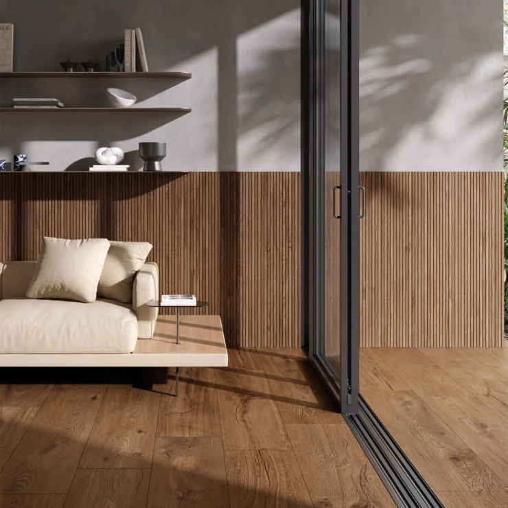 Grainwood finns i formaten 90×90 cm, 20×120 cm, 30×120 cm och 60×120 cm, vilket ger flexibilitet i kombinationer – från kvadratiska ytor till längre plankliknande layouter som förstärker träkänslan i golv och väggar.