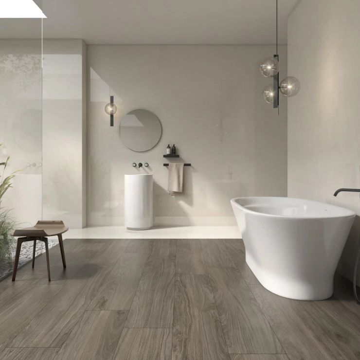 Kollektionen finns i rektifierade format 20×120 cm, 25×150 cm, 30×180 cm och 120×280 cm, vilket gör det enkelt att skapa enhetliga och eleganta ytor från golv till vägg.