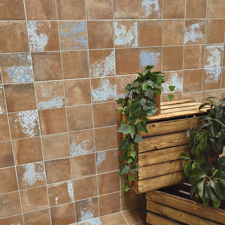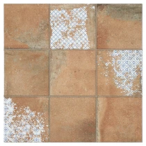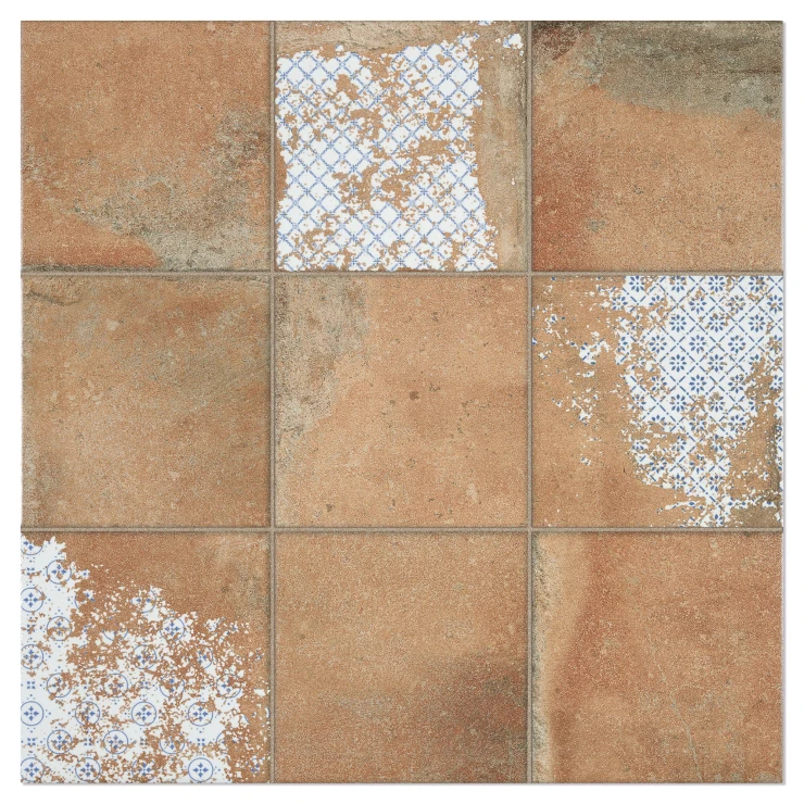 Kollektionen finns i två klassiska basfärger - Koppar och Beige - samt flera dekorerade versioner. Dessa plattor kombinerar en varm terrakotta­yta med en unik genomslipad effekt som avslöjar subtila geometriska mönster under ytan. Mönstren - mot vit eller blå botten - framträder som små fragment, nästan som om de har återupptäckts genom tidens naturliga slitage. Resultatet är en yta med djup, karaktär och en genuin hantverkskänsla, inspirerad av historiska golv som långsamt visar sina lager.