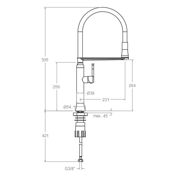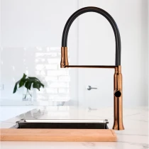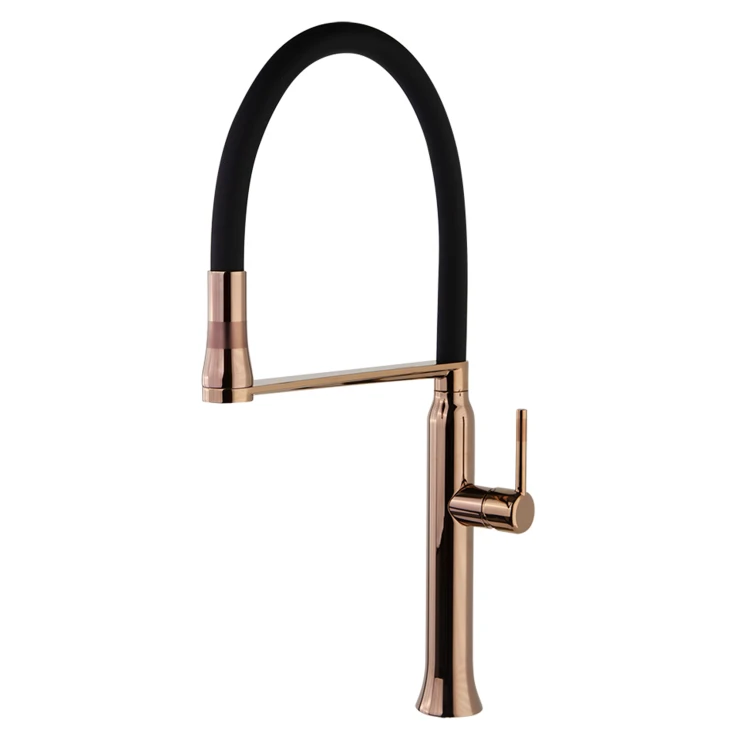 En ettgrepps köksblandare med stilren design och en höjd på 535 mm. Blandaren har en orienterbar, utdragbar och 360° svängbar pip med silikonfinish, samt ett innovativt magnetsystem som gör att munstycket enkelt återgår till sin normala position. Utförd i en elegant kopparfinish och utrustad med ett patenterat korrosionsbeständigt system för lång hållbarhet och extra motståndskraft. Den keramiska insatsen Ø25 mm ger mjuk, stabil och exakt reglering av både temperatur och flöde.