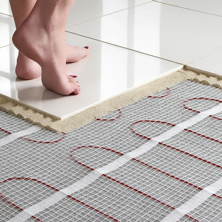 DEVImat™ 100T är en färdigmonterad elektrisk golvvärmematta som kombinerar en ultratunn tvåledarkabel (3 mm) med ett självhäftande nät, vilket ger snabb och enkel installation direkt i kakellim. Den är idealisk för rektangulära eller öppna ytor som kök, hallar och badrum.