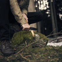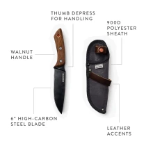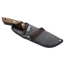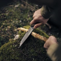• Fältkniv – en oumbärlig följeslagare för alla friluftsentusiaster. Denna klassiska fältkniv är tillverkad i värmebehandlat SK5 kolstål med full tång för maximal styrka och balans. Det svarta oxidskiktet skyddar mot rost och fukt, medan det ergonomiska handtaget i valnöt ger ett säkert och bekvämt grepp även under krävande utomhusförhållanden. Kopparringen i skaftet fungerar både som detalj och som upphängningsögla. Perfekt för allt från vedklyvning och tändved till matlagning och hantverk i fält.