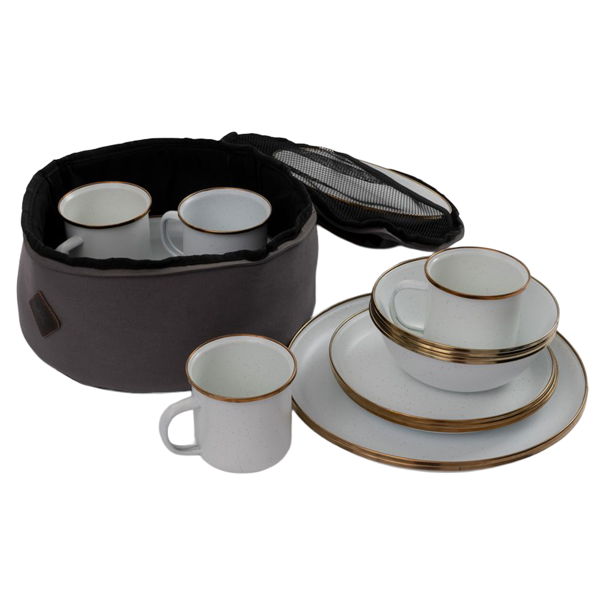 • - Plats för komplett servis för fyra personer (4 djupa tallrikar, 4 assietter, 4 skålar, 4 emaljmuggar) utan avdelare