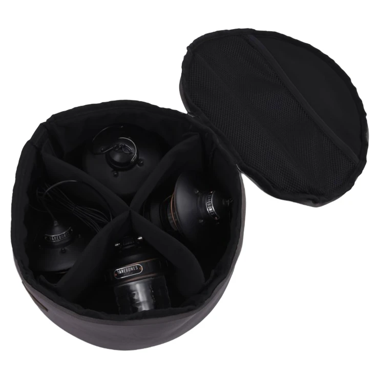 • De avtagbara inneravdelarna gör väskan flexibel: använd för att förvara upp till fyra små Barebones-lyktor, eller ta bort kardborreavdelarna för att skapa utrymme för ett komplett servis-set i emalj för fyra personer. En intern meshficka gör det enkelt att förvara små tillbehör, sladdar och ömtåliga saker.