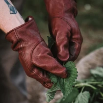 • De gör arbetet enkelt och smidigt – oavsett om du hanterar taggiga växter, torr bark eller grov jord. Handskarna är tillverkade i mjuk, naturlig kohud som är varm, andningsbar och slitstark. Den elastiska baksidan håller dem på plats, medan tumdesignen med keystone-söm ger bättre rörlighet och grepp. Finns i tre storlekar och två färger.