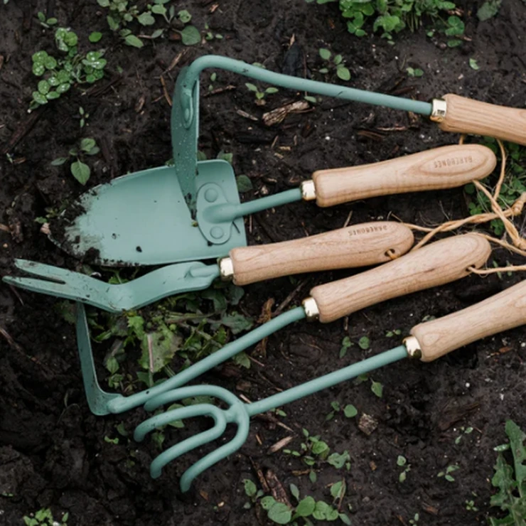 • Hackan är tillverkad med ett ergonomiskt handtag i valnöt eller ask och ett värmebehandlat blad i rostfritt stål med koppardetaljer. Välj mellan två uttryck: valnöt och svartoxiderat stål för en naturlig, rustik känsla, eller ask och mintfärgad emalj för en livfull kontrast som sticker ut i jorden.