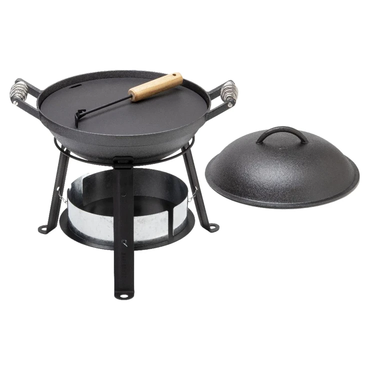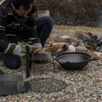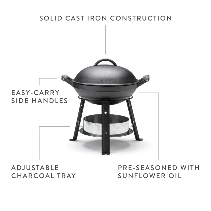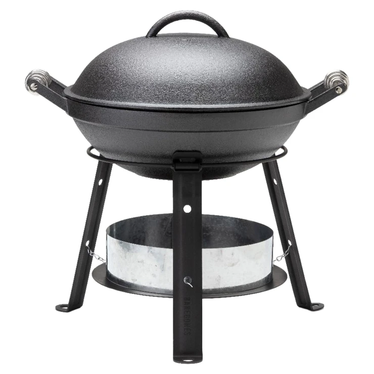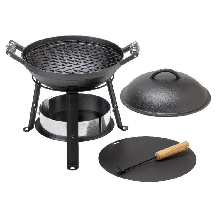 • Den robusta basen i gjutjärn och det kupolformade locket ger jämn värmefördelning, medan grillgallret, bakstålet, trefoten och kolbrickan låter dig skapa otaliga kombinationer beroende på rätt och tillagningsmetod. Alla delar packas smidigt ihop till ett kompakt set, perfekt för camping, trädgården eller strandutflykten.